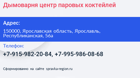 Дымоварня, центр паровых коктейлей по адресу 150000, Ярославская область, Ярославль, Республиканская, 56а в дальнейшем Организация, размещена в следующих категориях: