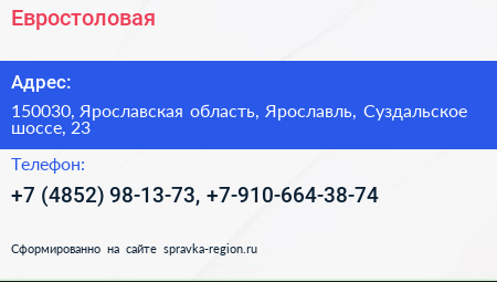 Евростоловая по адресу 150030, Ярославская область, Ярославль, Суздальское шоссе, 23 в дальнейшем Организация, размещена в следующих категориях: