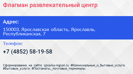 Флагман, развлекательный центр по адресу 150003, Ярославская область, Ярославль, Республиканская, 7 в дальнейшем Организация, размещена в следующих категориях: