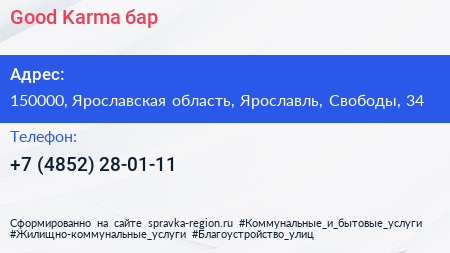 Good Karma, бар по адресу 150000, Ярославская область, Ярославль, Свободы, 34 в дальнейшем Организация, размещена в следующих категориях: