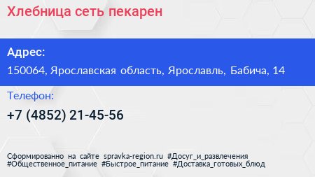Хлебница, сеть пекарен по адресу 150064, Ярославская область, Ярославль, Бабича, 14 в дальнейшем Организация, размещена в следующих категориях: