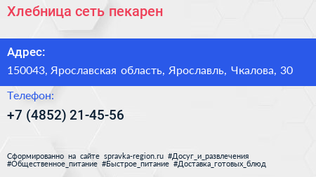 Хлебница, сеть пекарен по адресу 150043, Ярославская область, Ярославль, Чкалова, 30 в дальнейшем Организация, размещена в следующих категориях: