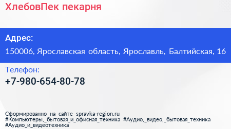 ХлебовПек, пекарня по адресу 150006, Ярославская область, Ярославль, Балтийская, 16 в дальнейшем Организация, размещена в следующих категориях: