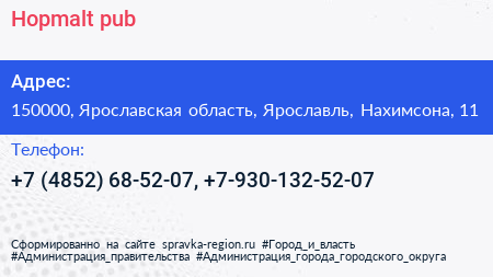 Hopmalt pub по адресу 150000, Ярославская область, Ярославль, Нахимсона, 11 в дальнейшем Организация, размещена в следующих категориях: