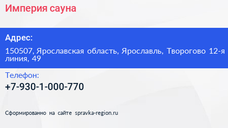 Империя, сауна по адресу 150507, Ярославская область, Ярославль, Творогово 12-я линия, 49 в дальнейшем Организация, размещена в следующих категориях:
