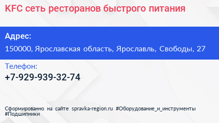 KFC, сеть ресторанов быстрого питания по адресу 150000, Ярославская область, Ярославль, Свободы, 27 в дальнейшем Организация, размещена в следующих категориях:
