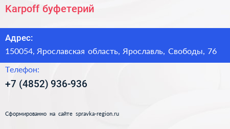 Karpoff, буфетерий по адресу 150054, Ярославская область, Ярославль, Свободы, 76 в дальнейшем Организация, размещена в следующих категориях: