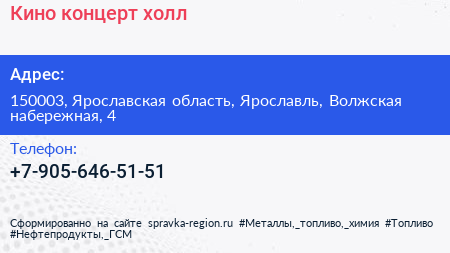 Кино, концерт-холл по адресу 150003, Ярославская область, Ярославль, Волжская набережная, 4 в дальнейшем Организация, размещена в следующих категориях: