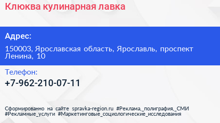Клюква, кулинарная лавка по адресу 150003, Ярославская область, Ярославль, проспект Ленина, 10 в дальнейшем Организация, размещена в следующих категориях: