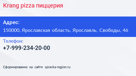 Krang pizza, пиццерия по адресу 150000, Ярославская область, Ярославль, Свободы, 46 в дальнейшем Организация, размещена в следующих категориях: