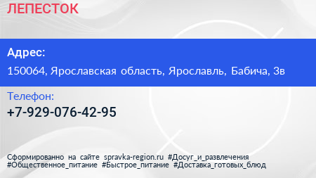 ЛЕПЕСТОК по адресу 150064, Ярославская область, Ярославль, Бабича, 3в в дальнейшем Организация, размещена в следующих категориях: