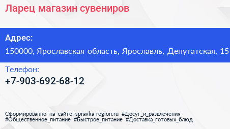 Ларец, магазин сувениров по адресу 150000, Ярославская область, Ярославль, Депутатская, 15 в дальнейшем Организация, размещена в следующих категориях: