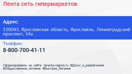 Лента, сеть гипермаркетов по адресу 150045, Ярославская область, Ярославль, Ленинградский проспект, 54а в дальнейшем Организация, размещена в следующих категориях:
