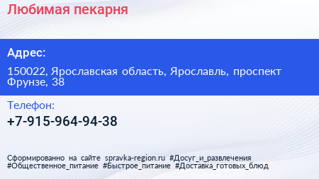 Любимая, пекарня по адресу 150022, Ярославская область, Ярославль, проспект Фрунзе, 38 в дальнейшем Организация, размещена в следующих категориях: