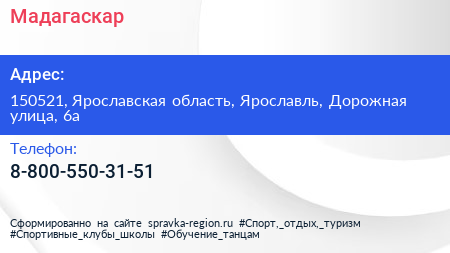 Мадагаскар по адресу 150521, Ярославская область, Ярославль, Дорожная улица, 6а в дальнейшем Организация, размещена в следующих категориях: