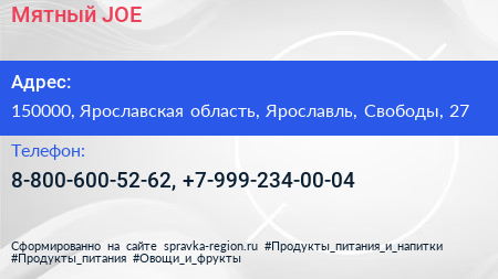 Мятный JOE по адресу 150000, Ярославская область, Ярославль, Свободы, 27 в дальнейшем Организация, размещена в следующих категориях: