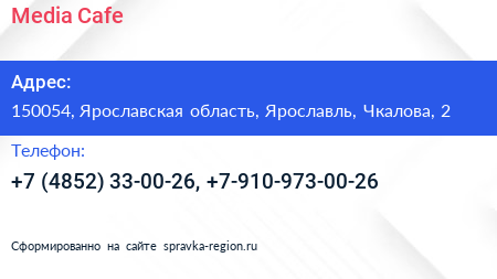 Media Cafe по адресу 150054, Ярославская область, Ярославль, Чкалова, 2 в дальнейшем Организация, размещена в следующих категориях: