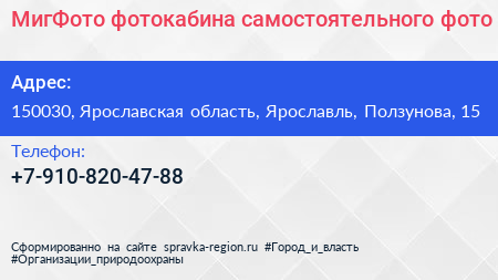 МигФото, фотокабина самостоятельного фото по адресу 150030, Ярославская область, Ярославль, Ползунова, 15 в дальнейшем Организация, размещена в следующих категориях:
