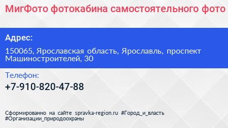 МигФото, фотокабина самостоятельного фото по адресу 150065, Ярославская область, Ярославль, проспект Машиностроителей, 30 в дальнейшем Организация, размещена в следующих категориях: