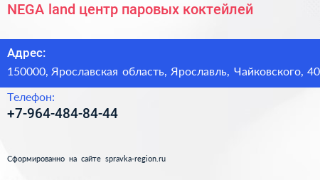 NEGA.land, центр паровых коктейлей по адресу 150000, Ярославская область, Ярославль, Чайковского, 40 в дальнейшем Организация, размещена в следующих категориях:
