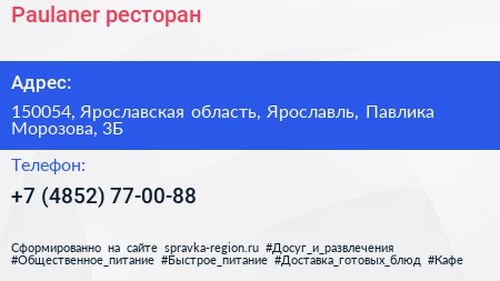Paulaner, ресторан по адресу 150054, Ярославская область, Ярославль, Павлика Морозова, 3Б в дальнейшем Организация, размещена в следующих категориях: