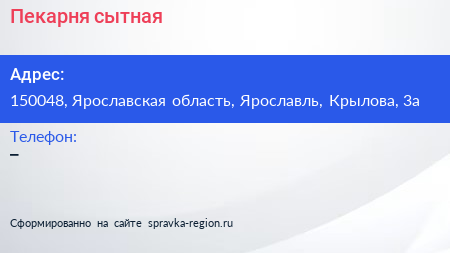 Пекарня сытная по адресу 150048, Ярославская область, Ярославль, Крылова, 3а в дальнейшем Организация, размещена в следующих категориях: