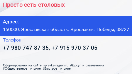 Просто, сеть столовых по адресу 150000, Ярославская область, Ярославль, Победы, 38/27 в дальнейшем Организация, размещена в следующих категориях: