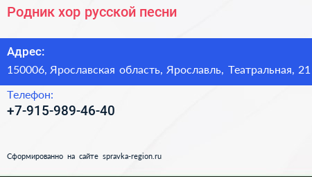 Родник, хор русской песни по адресу 150006, Ярославская область, Ярославль, Театральная, 21 в дальнейшем Организация, размещена в следующих категориях: