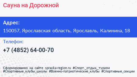Сауна на Дорожной по адресу 150057, Ярославская область, Ярославль, Калинина, 18 в дальнейшем Организация, размещена в следующих категориях: