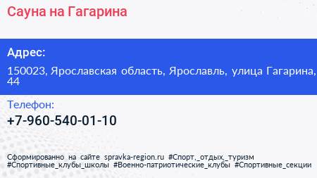 Сауна на Гагарина по адресу 150023, Ярославская область, Ярославль, улица Гагарина, 44 в дальнейшем Организация, размещена в следующих категориях: