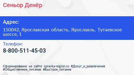 Сеньор Денёр по адресу 150042, Ярославская область, Ярославль, Тутаевское шоссе, 1 в дальнейшем Организация, размещена в следующих категориях: