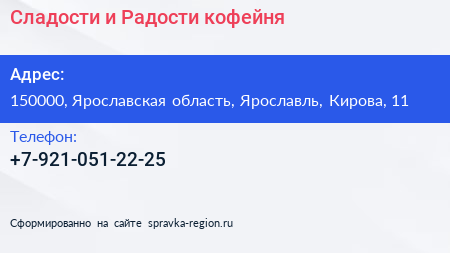 Сладости и Радости, кофейня по адресу 150000, Ярославская область, Ярославль, Кирова, 11 в дальнейшем Организация, размещена в следующих категориях: