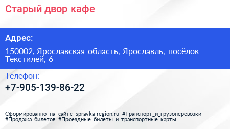 Старый двор, кафе по адресу 150002, Ярославская область, Ярославль, посёлок Текстилей, 6 в дальнейшем Организация, размещена в следующих категориях: