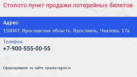 Столото, пункт продажи лотерейных билетов по адресу 150047, Ярославская область, Ярославль, Чкалова, 17а в дальнейшем Организация, размещена в следующих категориях: