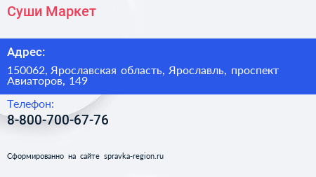 Суши-Маркет по адресу 150062, Ярославская область, Ярославль, проспект Авиаторов, 149 в дальнейшем Организация, размещена в следующих категориях: