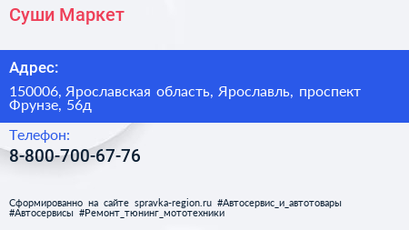 Суши-Маркет по адресу 150006, Ярославская область, Ярославль, проспект Фрунзе, 56д в дальнейшем Организация, размещена в следующих категориях: