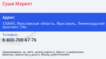 Суши-Маркет по адресу 150045, Ярославская область, Ярославль, Ленинградский проспект, 54а в дальнейшем Организация, размещена в следующих категориях: