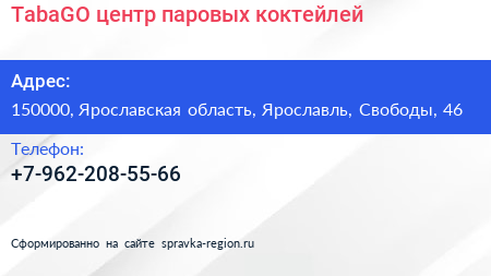 TabaGO, центр паровых коктейлей по адресу 150000, Ярославская область, Ярославль, Свободы, 46 в дальнейшем Организация, размещена в следующих категориях: