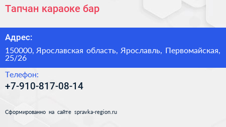 Тапчан, караоке-бар по адресу 150000, Ярославская область, Ярославль, Первомайская, 25/26 в дальнейшем Организация, размещена в следующих категориях:
