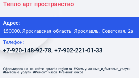 Тепло, арт-пространство по адресу 150000, Ярославская область, Ярославль, Советская, 2а в дальнейшем Организация, размещена в следующих категориях: