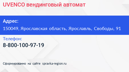 UVENCO, вендинговый автомат по адресу 150049, Ярославская область, Ярославль, Свободы, 91 в дальнейшем Организация, размещена в следующих категориях:
