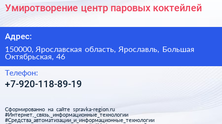 Умиротворение, центр паровых коктейлей по адресу 150000, Ярославская область, Ярославль, Большая Октябрьская, 46 в дальнейшем Организация, размещена в следующих категориях: