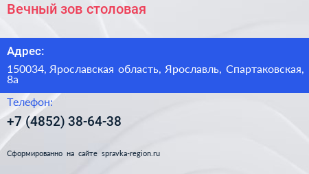 Вечный зов, столовая по адресу 150034, Ярославская область, Ярославль, Спартаковская, 8а в дальнейшем Организация, размещена в следующих категориях: