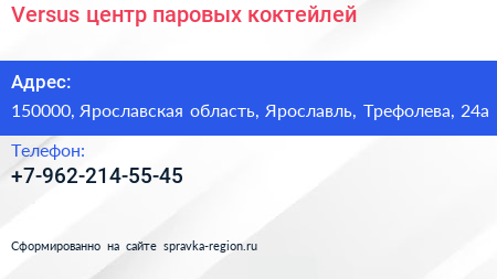 Versus, центр паровых коктейлей по адресу 150000, Ярославская область, Ярославль, Трефолева, 24а в дальнейшем Организация, размещена в следующих категориях: