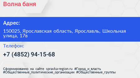 Волна, баня по адресу 150025, Ярославская область, Ярославль, Школьная улица, 17в в дальнейшем Организация, размещена в следующих категориях: