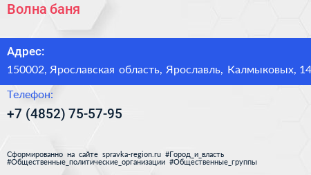 Волна, баня по адресу 150002, Ярославская область, Ярославль, Калмыковых, 14 в дальнейшем Организация, размещена в следующих категориях: