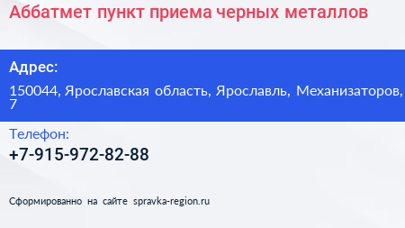 Аббатмет, пункт приема черных металлов по адресу 150044, Ярославская область, Ярославль, Механизаторов, 7 в дальнейшем Организация, размещена в следующих категориях: