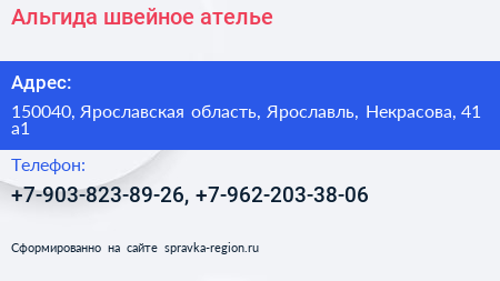 Альгида, швейное ателье по адресу 150040, Ярославская область, Ярославль, Некрасова, 41 а1 в дальнейшем Организация, размещена в следующих категориях: