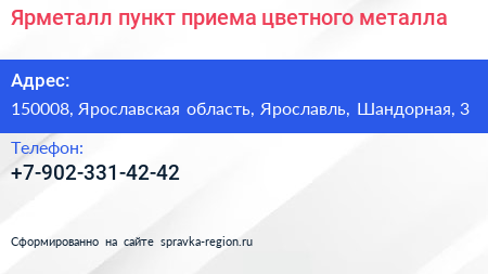 Ярметалл, пункт приема цветного металла по адресу 150008, Ярославская область, Ярославль, Шандорная, 3 в дальнейшем Организация, размещена в следующих категориях:
