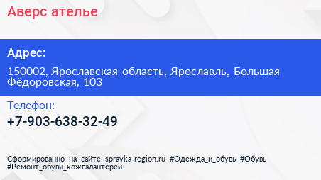 Аверс, ателье по адресу 150002, Ярославская область, Ярославль, Большая Фёдоровская, 103 в дальнейшем Организация, размещена в следующих категориях: